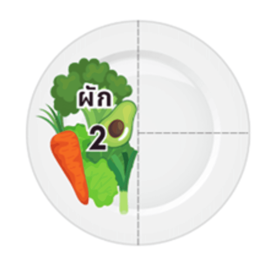 2 ส่วน (ครึ่งหนึ่งของจาน) : ผัก สามารถเลือกบริโภคได้ทั้งผักสดและผักสุก เพื่อให้ได้ใยอาหาร วิตามิน และแร่ธาตุต่าง ๆ