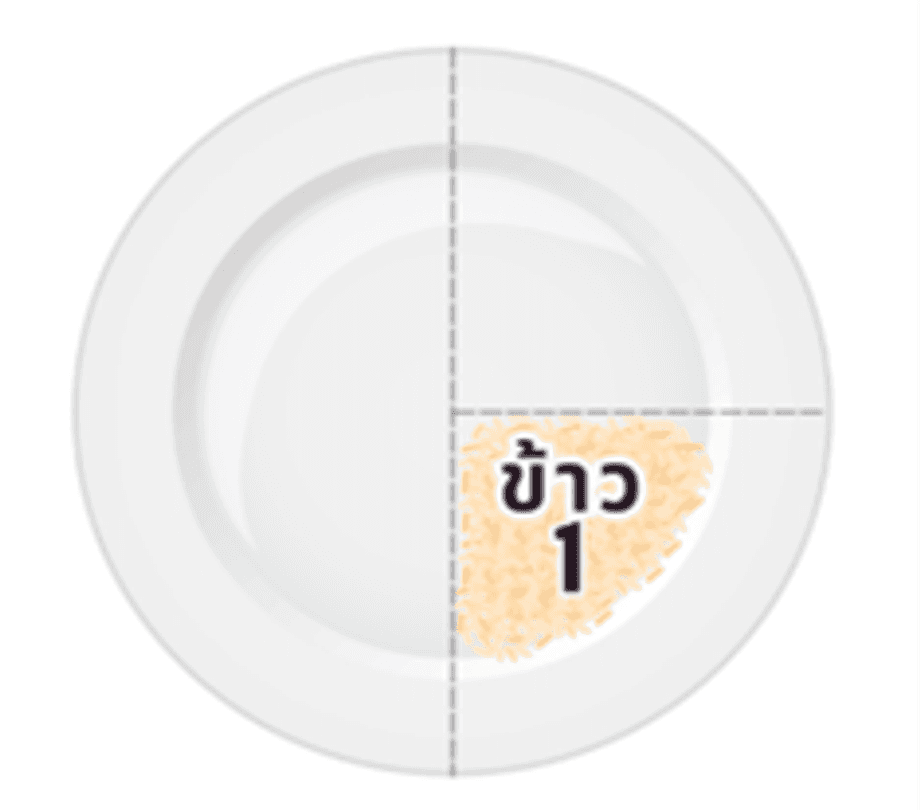 1 ส่วน (หนึ่งในสี่ของจาน) : ข้าว/แป้ง/เส้นต่าง ๆ ซึ่งเป็นแหล่งของคาร์โบไฮเดรต ควรเน้นชนิดไม่ขัดสี เช่น ข้าวกล้อง ขนมปังโฮลวีท