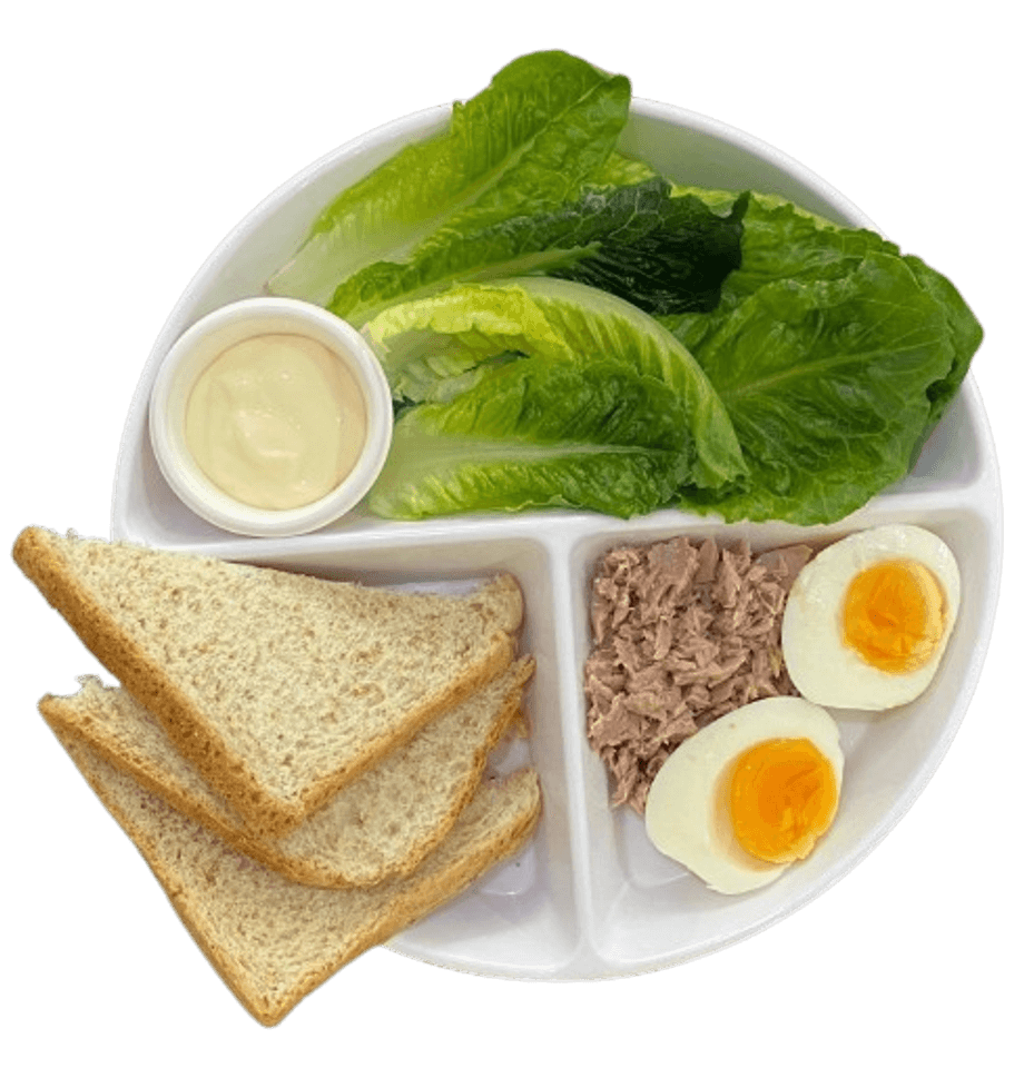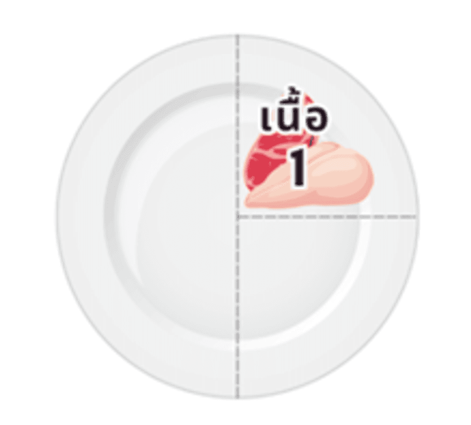 1 ส่วน (หนึ่งในสี่ของจาน) : เนื้อสัตว์ (โปรตีน) เลือกชนิดไขมันต่ำ เช่น ปลา, อกไก่หรือเนื้อไก่ไม่ติดหนัง, ไข่, เต้าหู้, เนื้อหมูหรือเนื้อวัวส่วนที่แทรกมันน้อย ๆ รวมถึง เน้นใช้วิธีการปรุงที่ไม่เพิ่มน้ำมันมากจนเกินไป เช่น ต้ม นึ่ง ย่าง ผัดน้ำมันน้อย