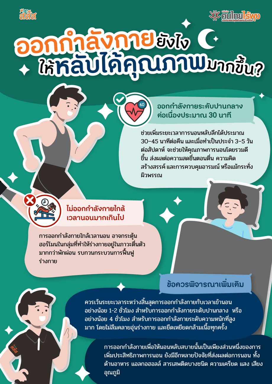 การนอนเป็นหนึ่งในสิ่งที่จำเป็นและน่าทึ่งที่สุดต่อร่างกาย เพียงแค่คุณนอนหลับอย่างเพียงพอและมีคุณภาพ ก็จะส่งผลดีต่อการทำงานของสมอง ความจำ การฟื้นฟูระบบต่าง ๆ ในร่างกาย การเจริญเติบโต ไปจนถึงการลดความเสี่ยงต่อโรคไม่ติดต่อเรื้อรัง จึงไม่แปลกที่หลายคนพยายามหาวิธีทำให้นอนหลับได้ง่ายและสบายที่สุด หนึ่งในวิธีที่นิยมก็คือการออกกำลังกายให้เหนื่อย เพื่อหวังว่าจะได้นอนหลับสบายขึ้น ซึ่งแม้จะเป็นความคิดที่ฟังดูเข้าท่า แต่ถ้าใช้ไม่ถูกวิธี ก็อาจกลับกลายเป็นผลเสียต่อการนอนแทนได้เช่นกัน
