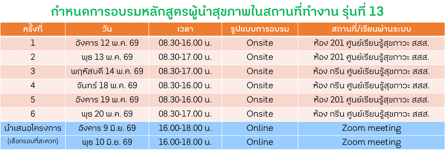 • ปรับหลักสูตรใหม่ เน้นการเรียนรู้แลกเปลี่ยนกับเพื่อน ๆ จากองค์กรอื่น พร้อมฝึกปฏิบัติแบบ onsite 6 วัน ที่อาคารศูนย์เรียนรู้สุขภาวะ สำนักงานกองทุนสนับสนุนการสร้างเสริมสุขภาพ เขตสาทร กรุงเทพมหานคร