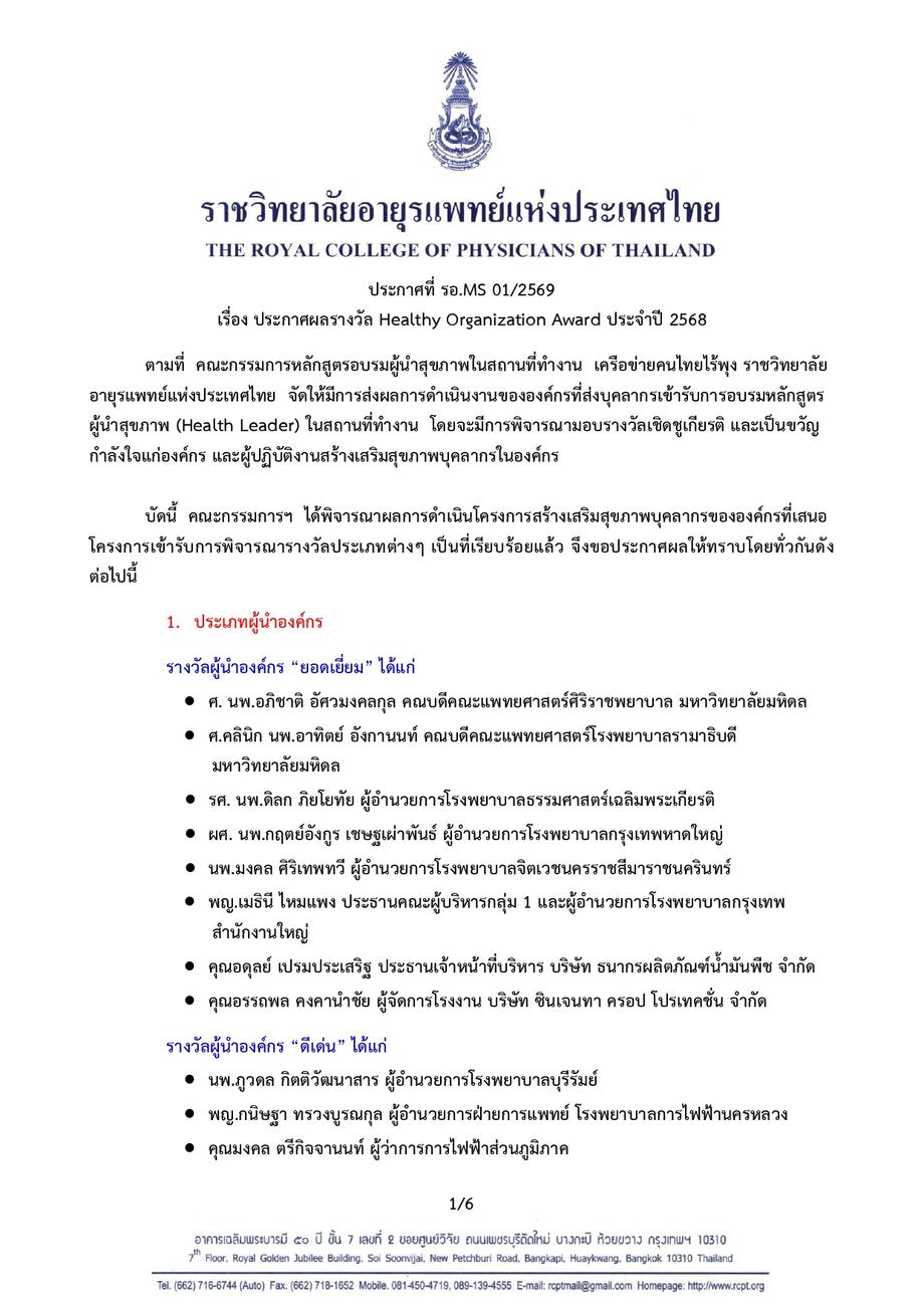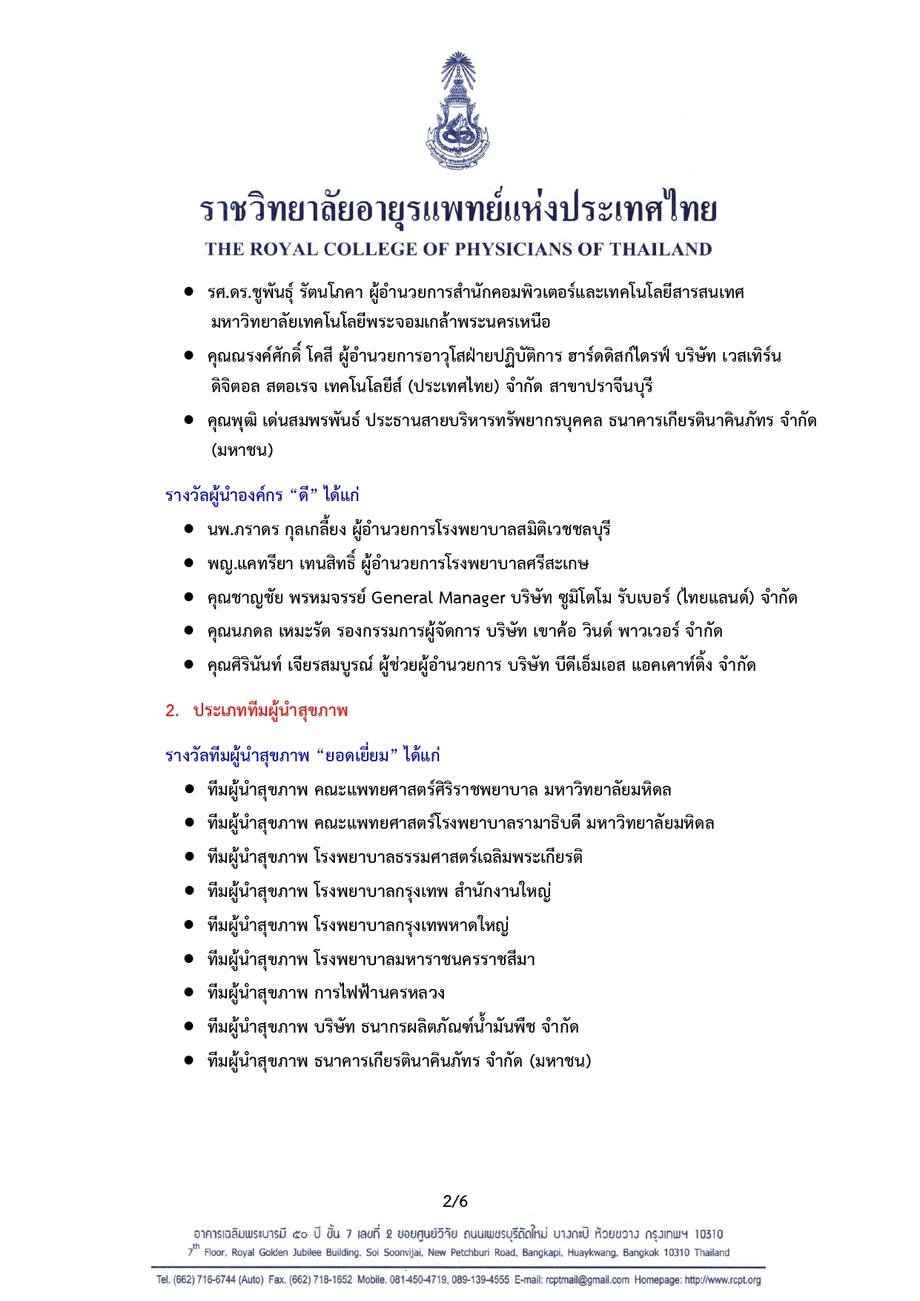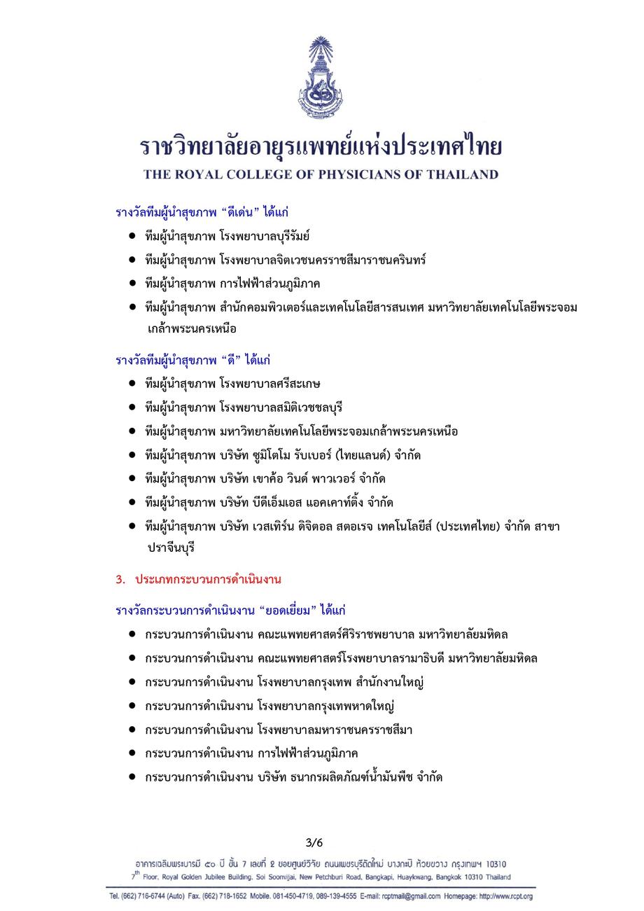 เครือข่ายคนไทยไร้พุง จัดให้มีการส่งผลการดำเนินงานขององค์กรที่ส่งบุคลากรเข้ารับการอบรมหลักสูตรผู้นำสุขภาพในสถานที่ทำงาน โดยพิจารณามอบรางวัล Healthy Organization Award เพื่อเป็นขวัญกำลังใจแก่องค์กร และผู้ปฏิบัติงานสร้างเสริมสุขภาพบุคลากรในองค์กร แบ่งออกเป็นรางวัลประเภทผู้นำองค์กร ทีมผู้นำสุขภาพ กระบวนการดำเนินงาน และนวัตกรรมการสร้างเสริมสุขภาพ และจัดพิธีมอบรางวัลในงาน Healthy Organization Day ซึ่งจัดขึ้นเป็นประจำทุกวันศุกร์สัปดาห์ที่สามของเดือน มกราคม ของทุกปี
